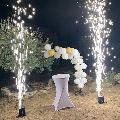 Location de machine à étincelle froide, jet de 2 à 3m, pour une ouverture de balle ou arrivée de gâteaux.